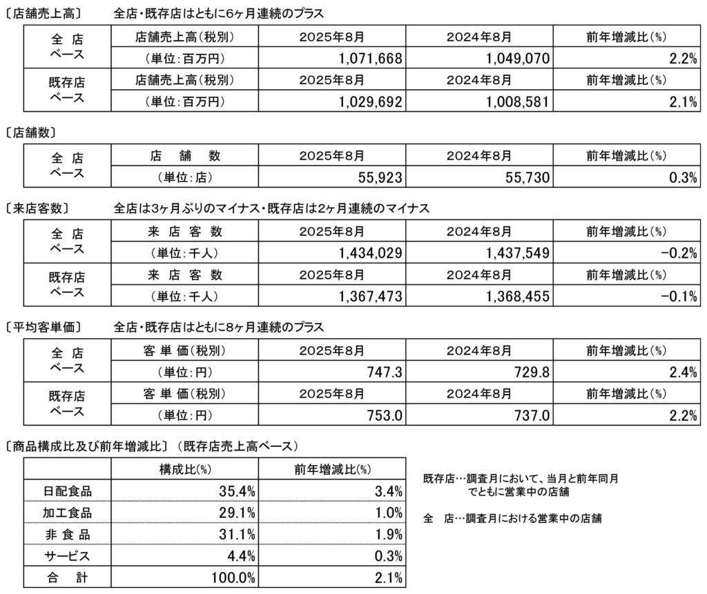 日本フランチャイズチェーン協会、2025年8月のコンビニエンスストア売上高を発表
