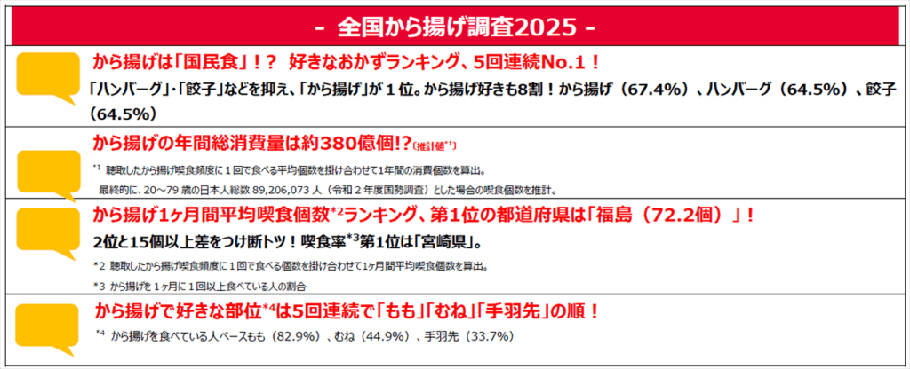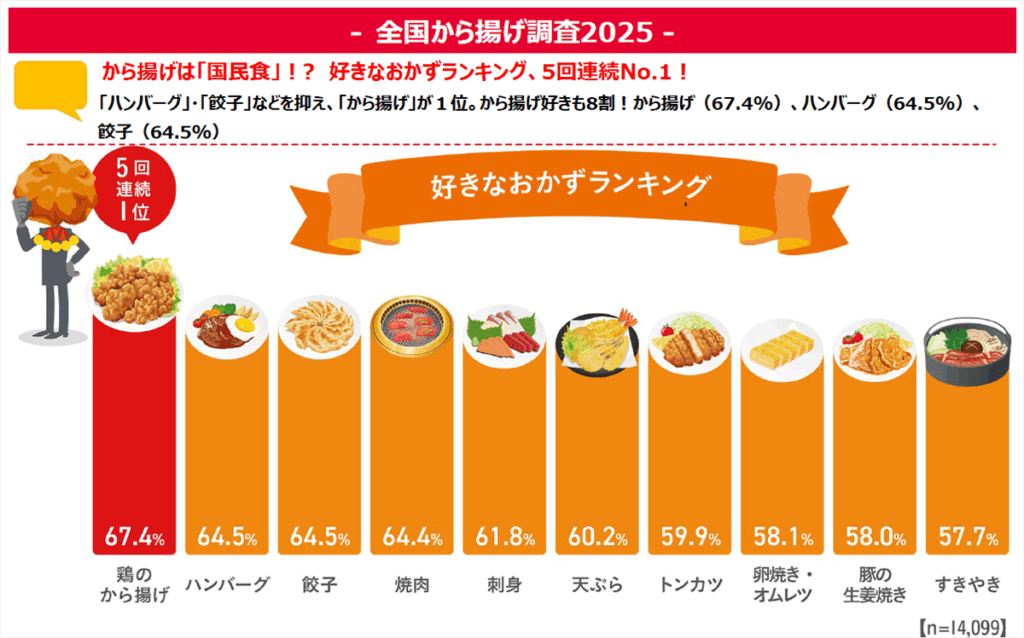 【ニチレイフーズ】<全国から揚げ調査2025>から揚げが「好きなおかずランキング」1位を達成!年間総消費量は380億個超(推計値)!