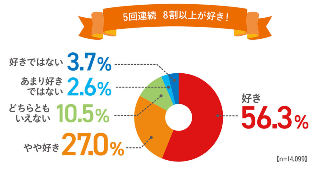 から揚げの好意レベルを聞いたところ、5回連続で8割近くが好きと回答した(「好き(56.3%)」、「やや好き(27.0%)」)。