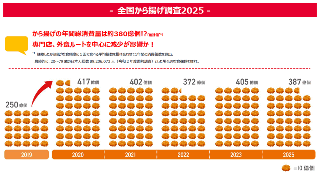 全国のから揚げ消費個数を推計で算出したところ、2025年の年間消費量は約380億個以上となる見込み。2023年調査との比べでは約95%程度に留まることが分かった。