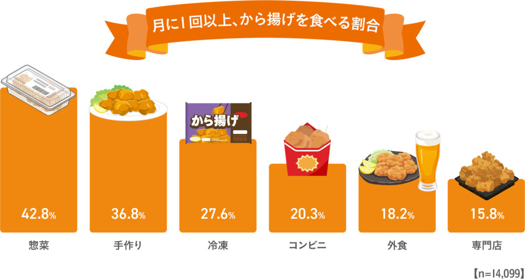 1ヶ月以内のから揚げ喫食率をルート別でみると、「惣菜」が42.8%と最も多く、次いで「手作り(36.8%)」「冷凍食品(27.6%)」「コンビニ(20.3%)」「外食(18.2%)」「鶏のから揚げ専門店(15.8%)」であった。