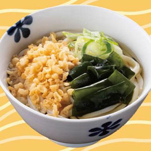 揚げ玉、わかめ、青ねぎを盛り付けた、たぬきうどん。つゆは、かつお,昆布,煮干しに加え雑節を使用した風味と旨味のある味わい。