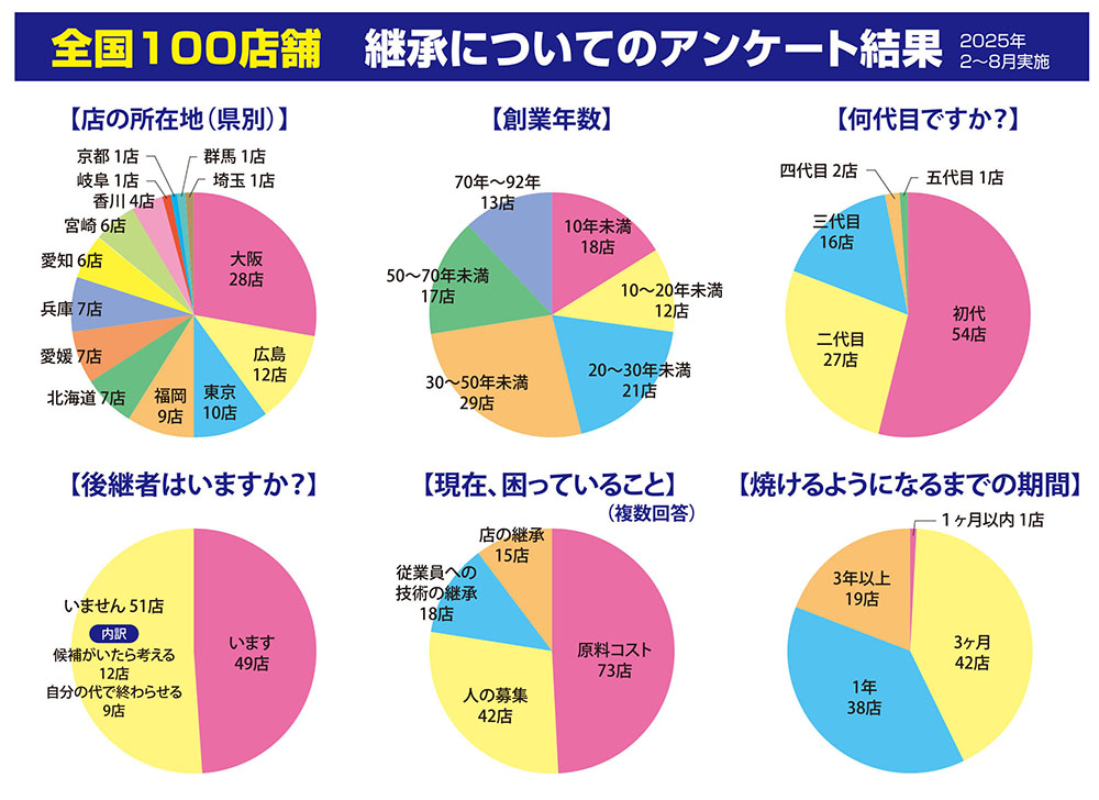 「大阪・関西万博で盛り上がる大阪、なかでも人気メニューのお好み焼であるが、若者のお好み焼離れが進み、閉業する店も多く、お好み焼に未来はあるのかという議論から、お好み焼の継承問題を全国の店主たちに本音を伺った。アンケートも実施したが、2035年問題を考えていきたい。」