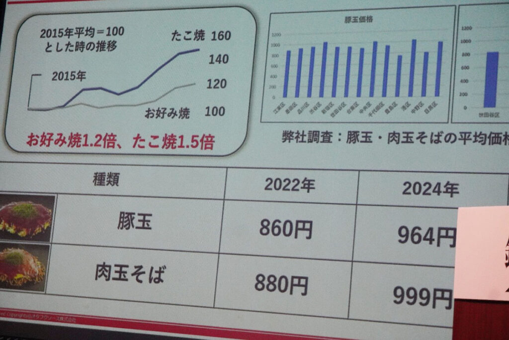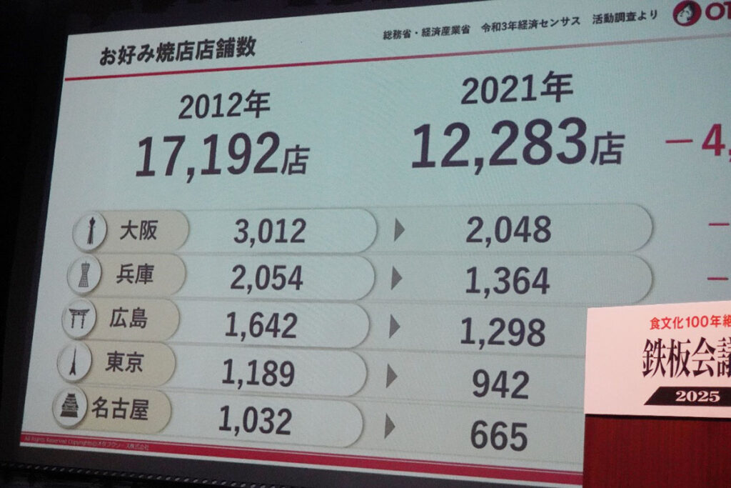 「お好み焼店の現状は厳しい状況で、お好み焼店の店舗数は2012年17,192店から、2021年に12,283店まで減少している。大阪、兵庫、広島という店舗数が多いエリアも減少している状況。また、原料コスト高騰の影響もあり、お好み焼・たこ焼の価格も1.2~1.5倍程度まで上昇してきたが、1000円の壁という価格問題の課題にも直面している。」
