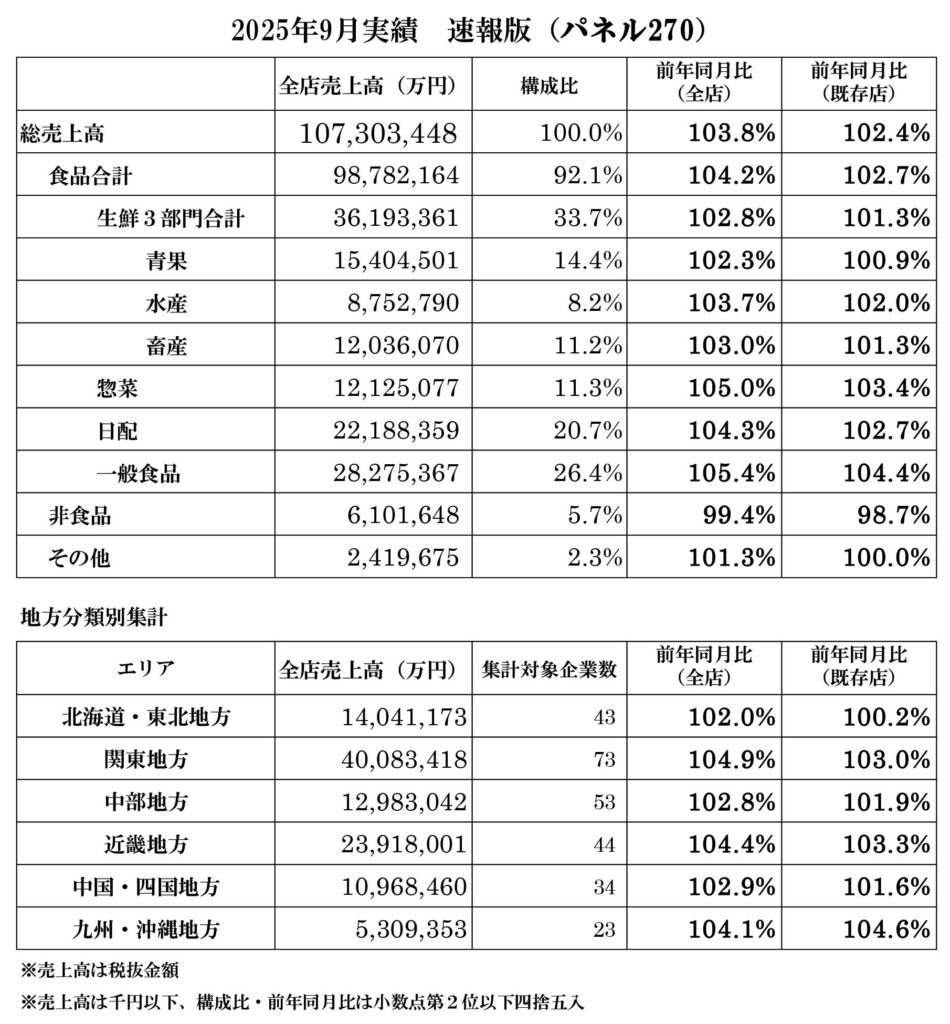 カテゴリー動向調査では、米の供給が安定した一般食品の上昇幅が大きい一方、前年より日曜日が一回少ない影響を受け畜産の下落幅が大きくなった。猛暑による調理敬遠志向を背景に惣菜DIは好調を維持、サンマ数量増により水産もプラス圏での推移となった。