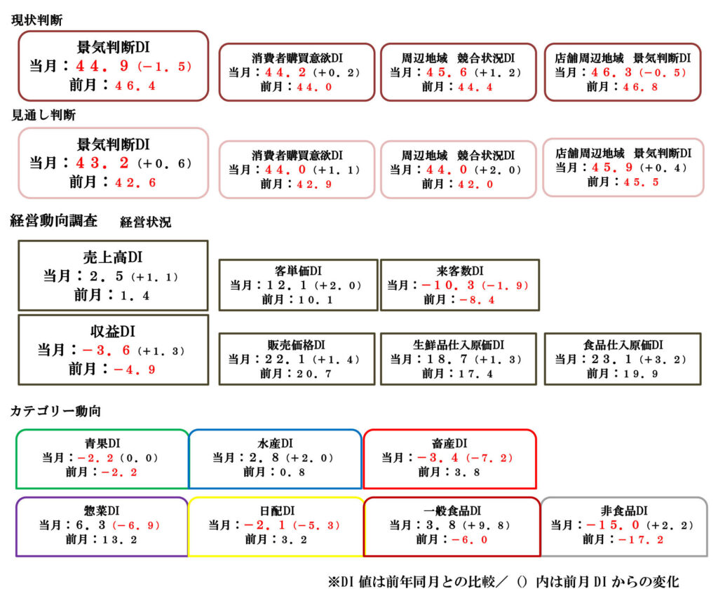 9月のスーパーマーケット中核店舗における景気判断DIの現状判断は、前月から-1.5の44.9、見通し判断が前月から+0.6の43.2となり、現状判断はやや悪化したものの、ほぼ前月水準での推移となった。