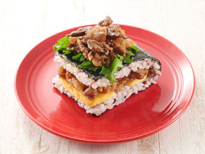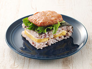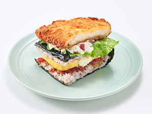 食感にこだわったポークミートと、やさしい味わいのたまご焼を挟みました。黒こしょうのパンチの効いたポークミートと、アクセントのからしマヨネーズとのコンビネーションがやみつきになる逸品です。ワンハンドBENTOシリーズでも一番崩れにくいため、食べやすく、持ち運びたいときなどにもぴったりです。