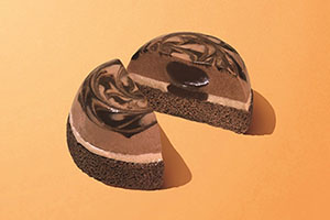 【内 容】ガトーショコラ生地の上にチョコホイップを円状に絞り、真ん中にチョコガナッシュを絞った土台に、マーブル模様が特徴的なドーム型のチョコムースを乗せました。ムースの中にはとろ~り濃厚なチョコソースが入っています。