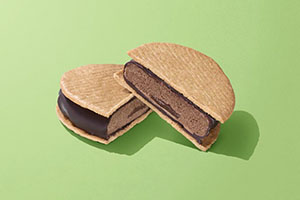 【内 容】中心にほんのりビターな味わいのチョコソースが入ったチョコクリームをパリっと食感のチョココーティングで覆い、サクっと食感のビスケット生地でサンドしました。
