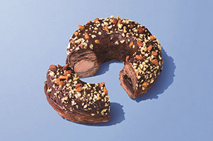 【内 容】ココア生地のクロワッサンドーナツに、チョコクリームとチョコホイップをサンドした商品です。表面をチョコでコーティングし、キャラメルクランチとキャンディングアーモンドをトッピングしました。