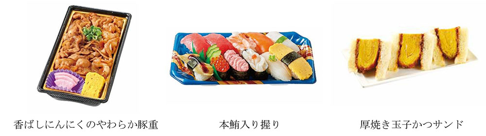 寿司は、ランチタイムでおむすび・ちらし寿司を豊富に品揃えし、惣菜と連動してランチニーズにお応えいたします。午後はにぎり寿司を中心に展開し、売場の変化で出来たての鮮度感を演出いたします。