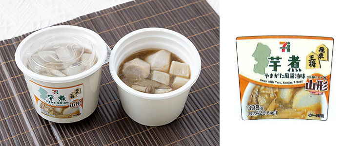 里芋に醤油ベースのスープと牛肉を合わせています。牛肉のコクと甘辛い醤油の香ばしさが染みわたるおいしさ。主に山形の南エリアで食べられている味付けです。