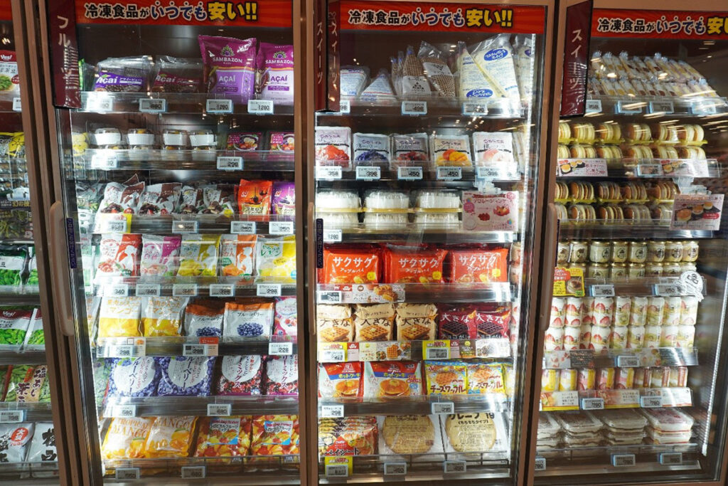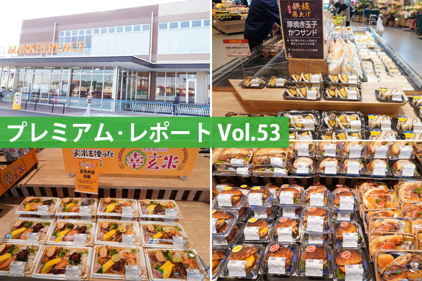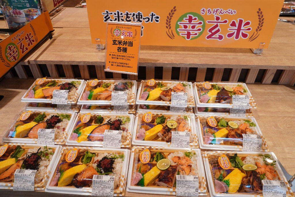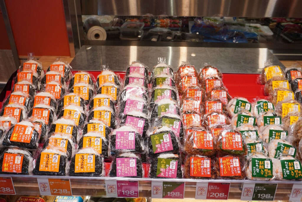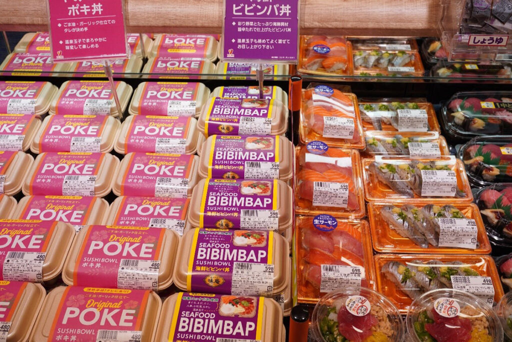 寿司は、ランチタイムでのおむすび・ちらし寿司を豊富に品揃えし、惣菜と連動してランチニーズに応える。午後は握り寿司を中心に展開し、売場の変化で出来立ての鮮度感を演出する。