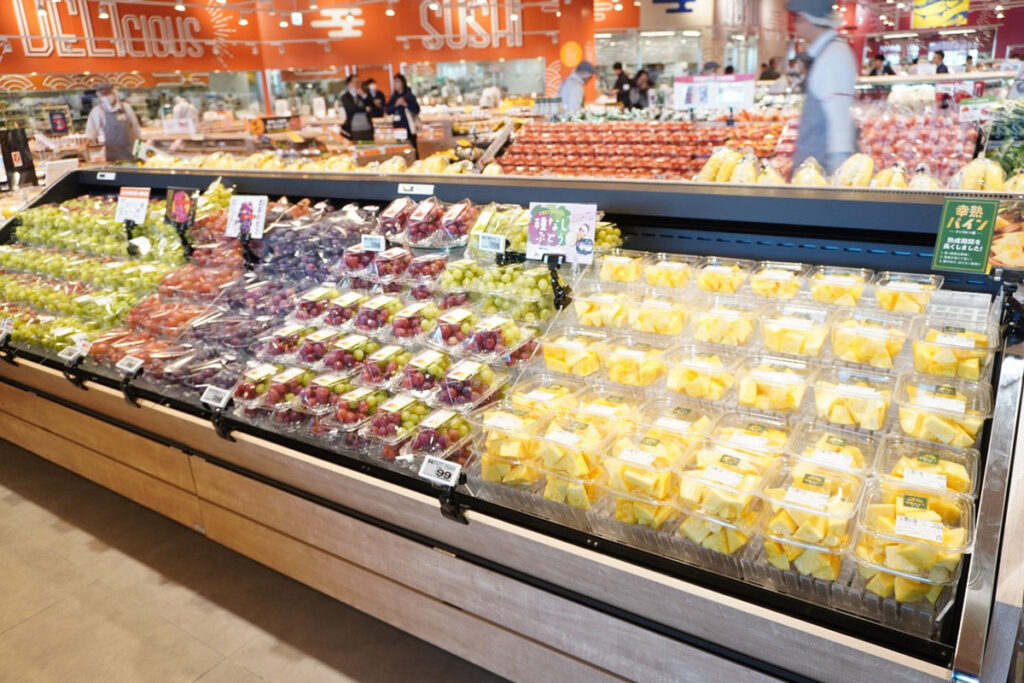 果実は季節感で選べる楽しさを訴求。カットフルーツ、デザートも展開。