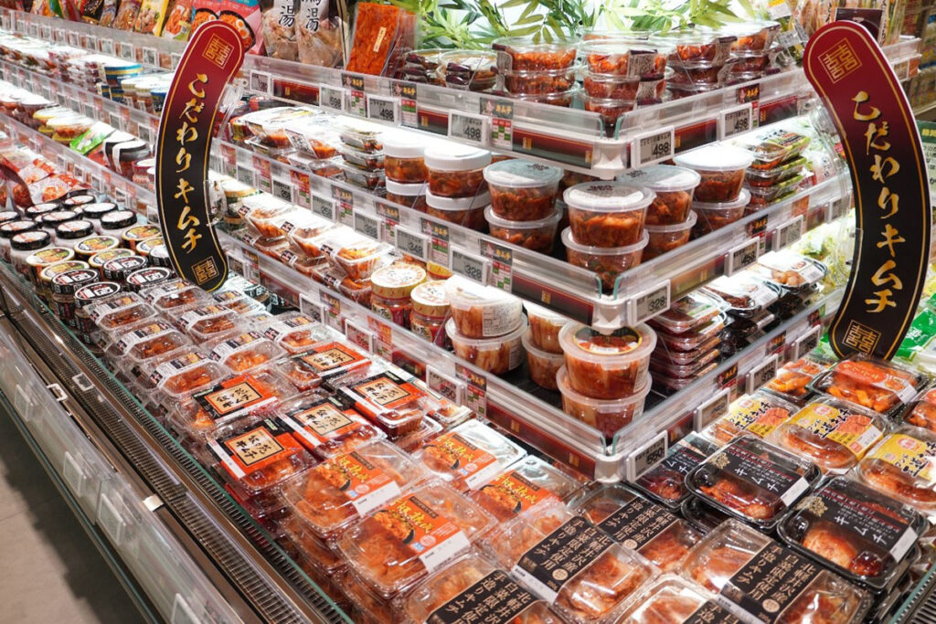 日配は、キムチを豊富に品揃え、生鮮と連動したメニュー提案を実施。