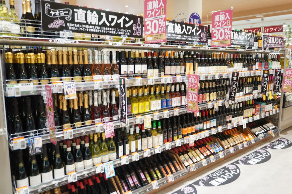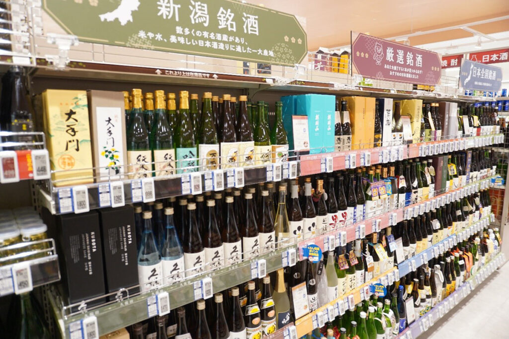 直輸入ワイン、全国の日本酒などの品揃えが豊富なリカー売場。