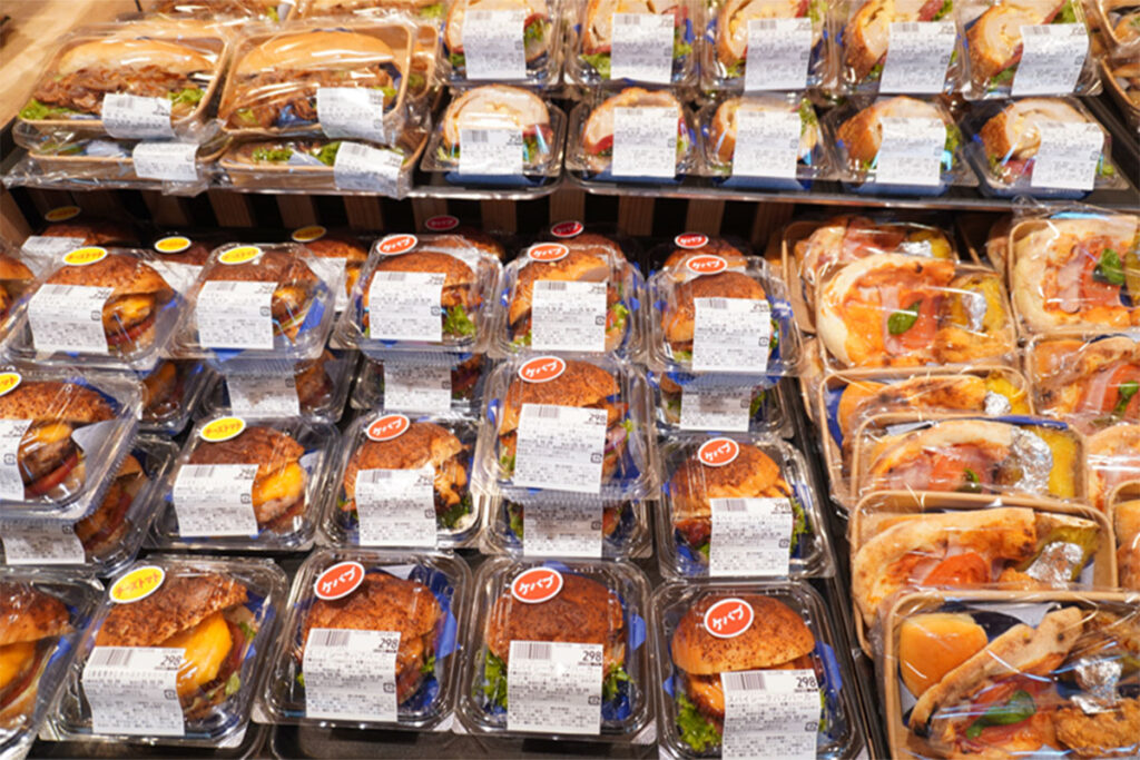 ベーカリーは、美味しさにこだわり、国産小麦粉使用・店内手伸ばしピザを豊富に品揃え。ランチタイムには、インストア加工のサンドイッチやバーガーを展開し、価格以上の美味しさを訴求する。