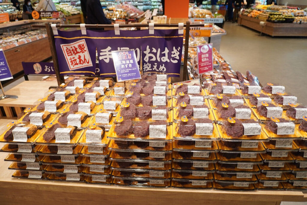 手握り「おはぎ」のボリューム陳列。あんをリニューアル。