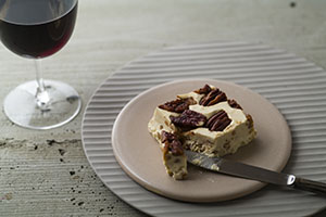クリームチーズに、キャラメルコーティングしたアーモンドとクルミを混ぜ込み、トッピングにはメープルシロップをまとったピーカンナッツをのせた一品。メープルシロップには、強い風味と香り高さが特長の「ダーク(ロバストテイスト)」という種類を選定。クリームチーズと調和しつつも口に入れた時にメープルの風味とナッツのコクを感じていただけるように仕上げました。ピーカンナッツは、食感を残すために自社セントラルキッチンで軽くローストした後にメープルシロップで和えており、ナッツの食感とクリームチーズの滑らかな食感のコントラストもお楽しみいただけます。