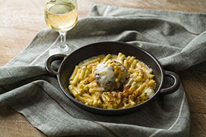 ナツメグを効かせたグラタンソースとじゃがいもを絡めた具材の上から、3時間以上煮込んだ牛ホホ肉と野菜の旨みが詰まったラグーソースをかけて焼き上げました。じゃがいもは、一番おいしいと言われる皮と実の間を残すため、蒸し上げてから一つひとつ手作業で丁寧に皮を剥いています。濃厚なラグーソースと、モッツァレラ、ゴーダ、パルミジャーノ・レジャーノの3種類のチーズで旨みとコクのある味わいに仕上げた、食べ応えのあるグラタンです。