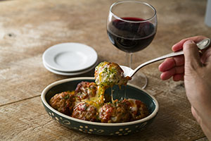 ローズマリーやナツメグを効かせた肉団子の上から、トマトソース、レッドチェダーを使用したチーズソースをかけ、その上からレッドチェダー、モッツァレラ、ゴーダの3種類のチーズをトッピングしました。チーズソースに使用するチーズは粘度や味の観点から何度も試作を行い、見た目にも鮮やかなレッドチェダーを採用しました。