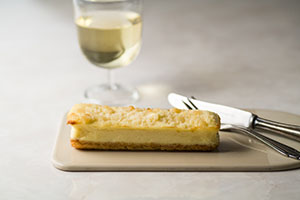 なめらかな口当たりと濃厚なチーズの味をお楽しみいただける、3層構造のチーズケーキです。サクサクとした食感が特長の優しい風味の塩バニラクッキー生地の上に、2層目はクリームチーズを50%以上配合したチーズケーキ生地をのせました。クリームチーズに、サワークリームとラム酒、バニラエッセンスを加えることで、濃厚なチーズの旨みとサワークリームの酸味、ラム酒やバニラエッセンスの香りのバランスが取れた生地に仕上げました。さらに一番上には、アーモンドプードルで作ったしっとりホロホロとした食感のシュトロイゼルをトッピング。濃厚な味わいと3層構造が生み出す食感をお楽しみください。