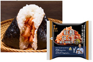 1954年に浅草で創業したおにぎりの名店「おにぎり浅草宿六」監修のおにぎりです。製造工場で一つ一つ丁寧に焼き上げた紅鮭を粗めにほぐし、中具として使用しました。さらに、紅鮭に柚子胡椒で風味豊かに味付けし、上品で奥深い味わいに仕上げました。素材の旨みと柚子胡椒の爽やかな香りが楽しめます。