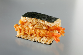 ふんわりとした衣でタレがよくなじむ尾つき海老天を2尾使用した食べ応えるのあるおにぎりです。ごはんには天丼のかけたれを混ぜ込み、コクと旨みをしっかりと感じられるよう仕立てました。アクセントとして、甘酢生姜をトッピングしました。海老天の食感と甘酢生姜の爽やかな風味が絶妙に調和した、こだわりのおにぎりです。