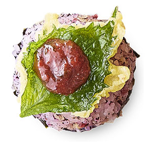 赤シソご飯に梅かつおを入れることで、梅の酸味と赤シソの爽快な香り、かつおの旨みが広がるおむすびです。