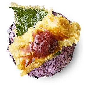 赤シソごはんにイカ天、そして大葉天と梅かつおが加わり、和の風味が広がるおむすびです。