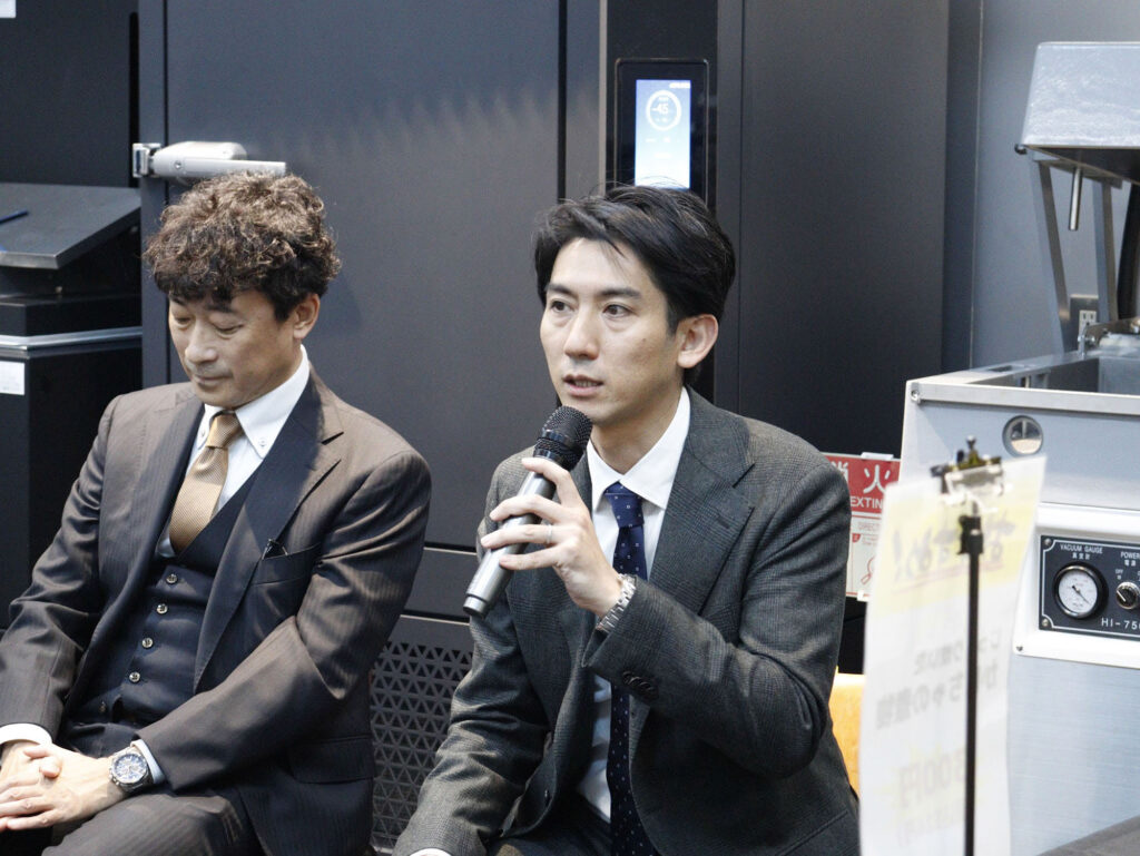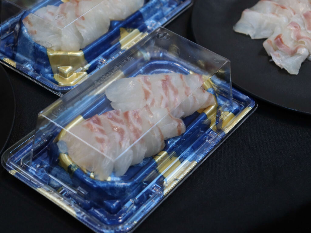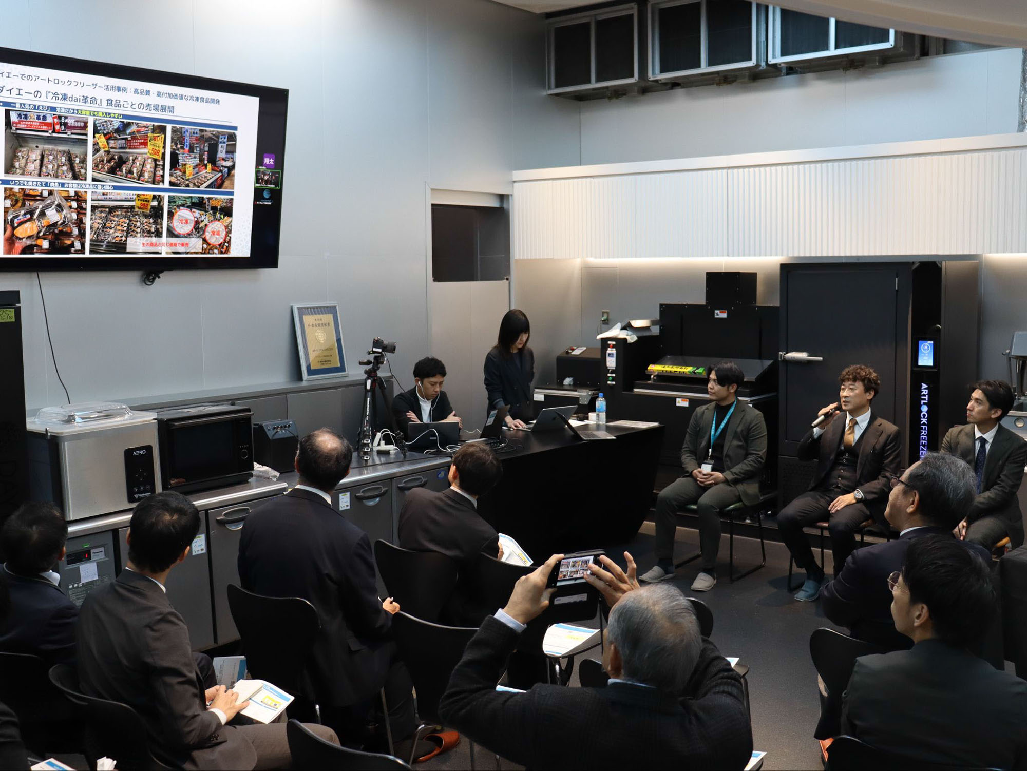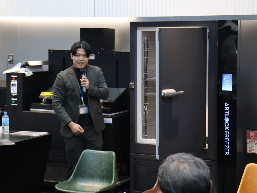 宮寺は、この技術を活用して、デリカセンターで刺身を高品質に冷凍し、各店舗へ配送しているスーパーの事例を紹介。加工スペースのない小規模店舗や魚を捌ける人材がいない現場でも高品質な鮮魚販売が可能になり、顧客満足度が向上したと解説しました。説明後には、実際にアートロックフリーザーを使った刺身の凍結デモを実施。美しく盛り付けた状態でそのまま凍結できることを実演し、会場の関心を集めました。