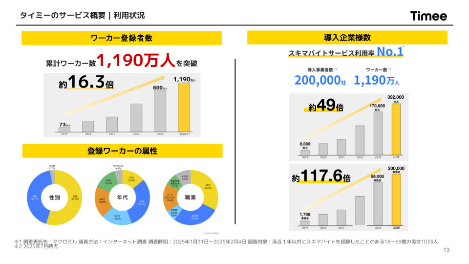 最初のセッションでは、株式会社タイミーの蘭氏が登壇。「タイミー」が支える小売・食品製造業界の人材確保について説明しました。「タイミー」の登録ワーカーは1,190万人、導入企業は20万社を突破(2025年7月時点)。レビュー機能や過去の就業実績、スキルの可視化など、高いマッチング精度を実現する機能が備わっています。