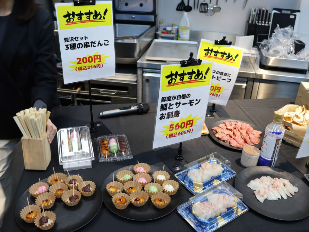 セミナー後半では、会場参加者向けに試食会を実施。刺身、ローストビーフ、かぼちゃの煮物、パン、団子といった惣菜・スイーツを、一度冷凍・保存したものを会場で解凍して提供し、スーパーの惣菜売場を再現しました。