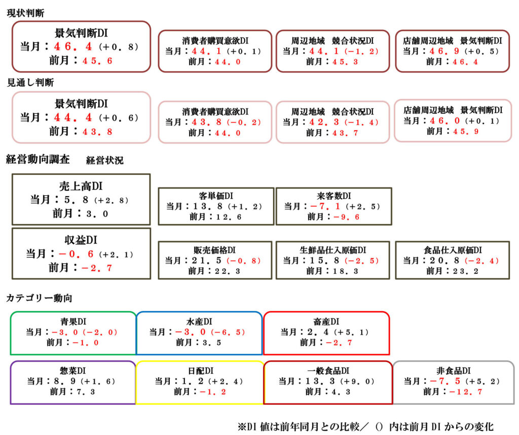 カテゴリー動向調査では、米が高値で推移し売上高としては好調となっている一般食品カテゴリーDIが、二桁プラス水準まで上昇した。惣菜DIは好調を維持、豚肉相場に落ち着きがみられた畜産DIもプラス圏を回復した。