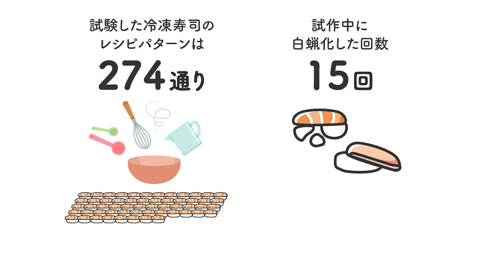 輸送方法によっては現地到着までに1ヶ月以上がかかり、温度変動のリスクがある海外輸送でも品質を保持するとともに、寿司の解凍工程で最も難しいとされる冷蔵解凍にも対応できる冷凍寿司を開発するために、試したレシピパターンは274通りでした。また、試作中に白蝋化(ご飯がボソボソと崩れ落ちるような、食感が劣化してしまう現象)した回数は15回。最適解を求めて改良を繰り返してきたことで、現在の品質に到達しています。