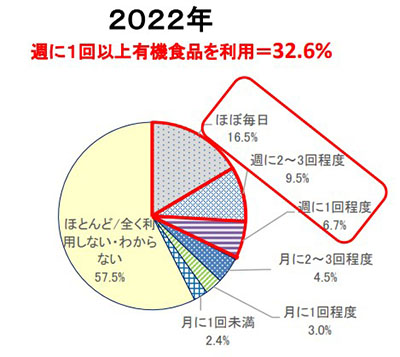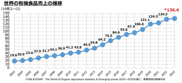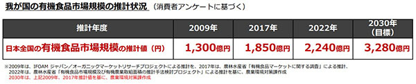 2025年に公開された農林水産省の報告によると、世界を見れば有機食品の市場は北欧諸国を中心に拡大を続けています(図1)。一方で日本は、有機食品を意識的に利用している方は半数未満で、消費額を見ても世界平均以下となっており、まだまだ市場が伸びる可能性を秘めております(図2, 3)。現に、農林水産省の調査では、2009年以降日本全国の有機食品市場規模は拡大を続けており、2030年には3,000億円を超える市場規模にすることが目標として掲げられています(図4)。