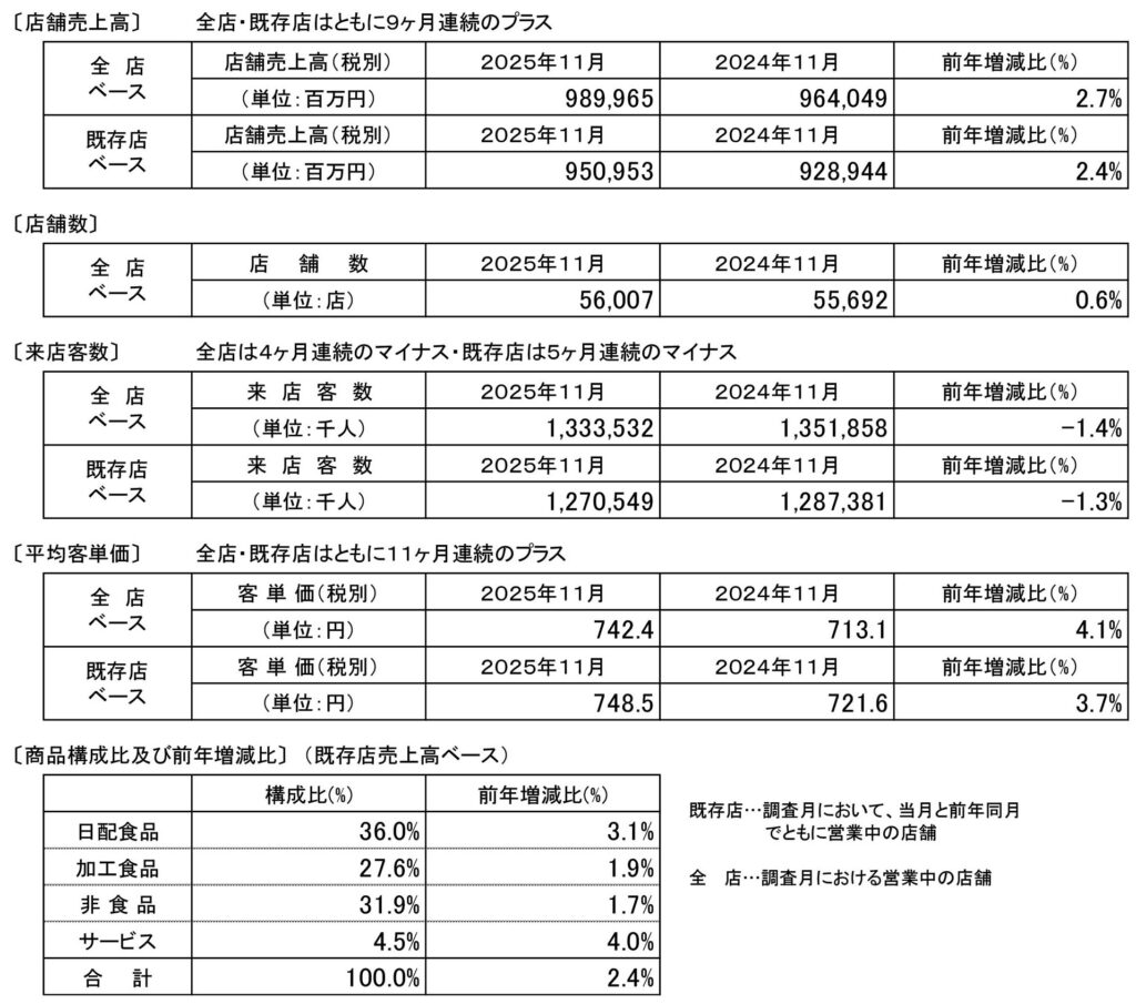 今月はブラックフライデーをはじめとする販促施策等により、おにぎり、調理パン、揚げ物、菓子が好調に推移、客単価も伸びたことから、全店・既存店ともに売上高が前年を上回る結果となった。