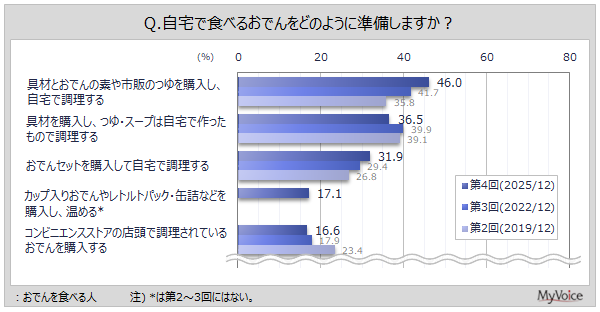 ■自宅で食べるおでんの準備方法は「具材とおでんの素や市販のつゆを購入し、自宅で調理する」が46%で増加傾向。「具材を購入し、つゆ・スープは自宅で作ったもので調理する」が4割弱