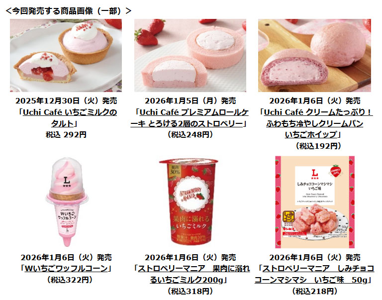 株式会社ローソンは、12月30日(火)から順次、全国のローソン店舗(約14,000店:2025年11月末時点、「ローソンストア100」除く)で、2026年の「いちごの日(※1)(1月15日)」にあわせて、築地発のいちごスイーツ専門店「ストロベリーマニア」(※2)とコラボレーションしたチルド飲料や菓子(計6品)を含む、いちごを使用した商品合計19品を発売いたします。ローソンで「ストロベリー マニア」とのコラボ商品を発売するのは今回が初めてです。