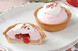 ほんのりといちごの香りがするカスタードを重ねて焼き上げたタルト生地に、いちごの果肉入りソース、いちごミルクホイップクリーム、ホイップクリームを絞りました。天面にはフリーズドライいちごをトッピングし、食感にアクセントをつけました。