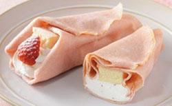 北海道産生クリームを使用したカスタードホイップクリーム、果肉入りのいちごソース、ベイクドチーズケーキをクレープ生地で包み、半分にカットした生いちごをトッピングしました。