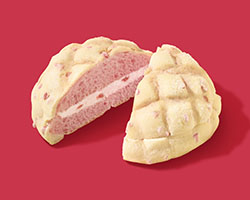 【内容】いちご風味チョコチップを練り込んだ白いビスケット生地をかぶせたメロンパンに、いちご果肉入りミルクホイップをサンドしました。