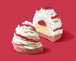 【内容】ホワイトチョコ入りのクリームに甘酸っぱいいちごのハーモニーが楽しめるモンブランです。さっくりとしたメレンゲの食感もポイントです。