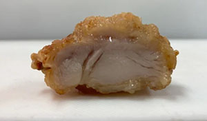 ・製品加工までチルド管理を徹底。お肉は工場で揚げるまで一切冷凍しないため、肉の旨味が出ていく「ドリップ」が少なく、おいしい状態で提供できます。