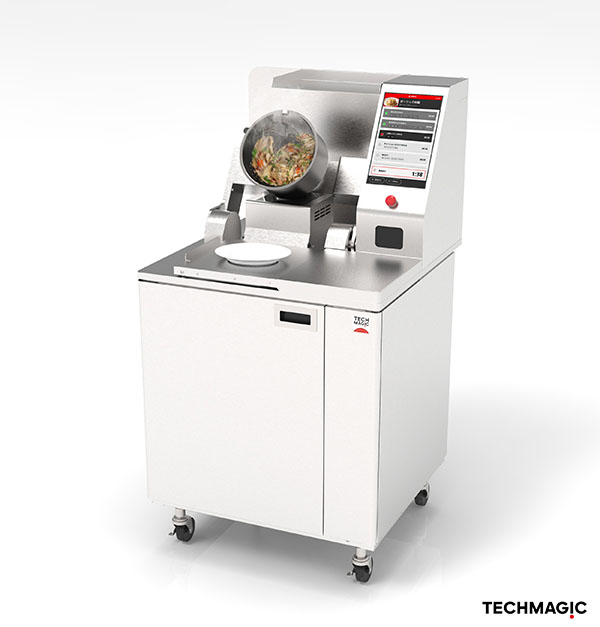 テックマジックが開発した調理ロボットI-Robo は、攪拌、加熱、調理後の鍋の洗浄といった一連の動作を自動化することができるロボットで、炒飯・野菜炒めなど、熟練の職人のレシピを自動で再現します。自動調理においては、メニューに応じて、加熱温度、加熱時間、鍋の回転スピード、回転方向を柔軟且つ適切に調整できます。I-Roboの導入により、人手不足の課題に対し省人化を推進し、人がより付加価値の高い業務に集中できる環境を目指します。