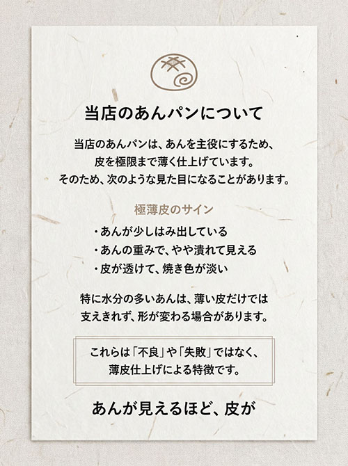 特に水分の多いあんは、薄い皮だけでは支えきれず、あんの重さで形が変わる場合があります。これらは「失敗」や「不良」ではなく、薄皮仕上げによる特徴です。