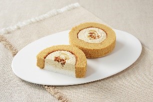 特 長 :紅茶クリームと、深いコクと強い甘みが特長の多良間島黒糖を使用した黒糖クリームを、紅茶風味のスポンジ生地で巻き、天面に黒糖ソースとアーモンドを盛り付けました。