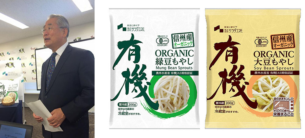 左)記者発表での中田 中)当時発売された有機緑豆もやし 右)当時発売された有機大豆もやし