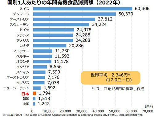 図1 国別1人あたりの年間有機食品消費額(2022年)