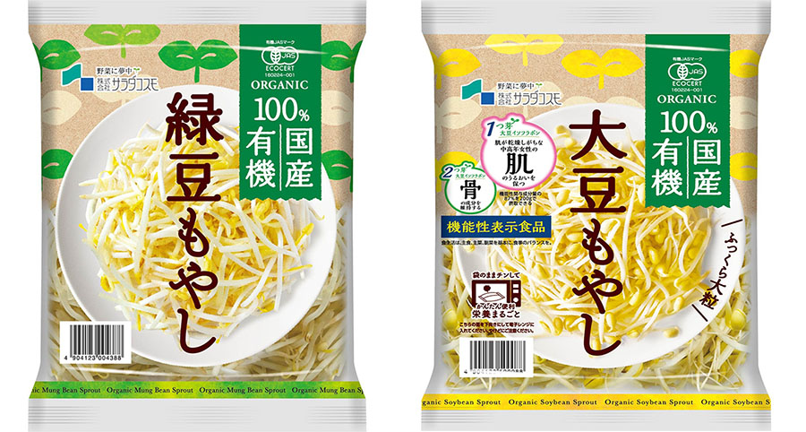 左)現在販売されている有機緑豆もやし 右)現在販売されている有機大豆もやし